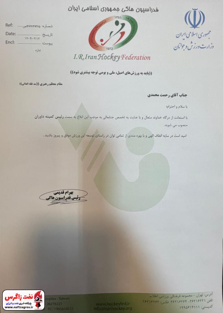 با حکم رئیس فدراسیون هاکی کشور صورت پذیرفت؛